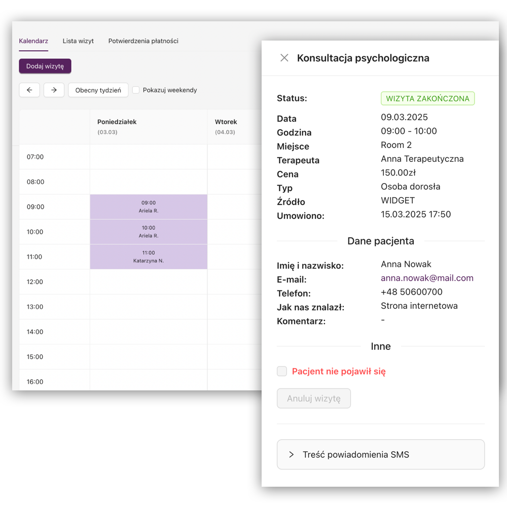 Tak. Możesz samodzielnie ustawiać grafiki specjalistów, godziny pracy, lokalizacje i usługi. Dodatkowo Twoje wiadomości e-mail do pacjentów mogą być spersonalizowane — z logo i kolorami Twojej marki.
