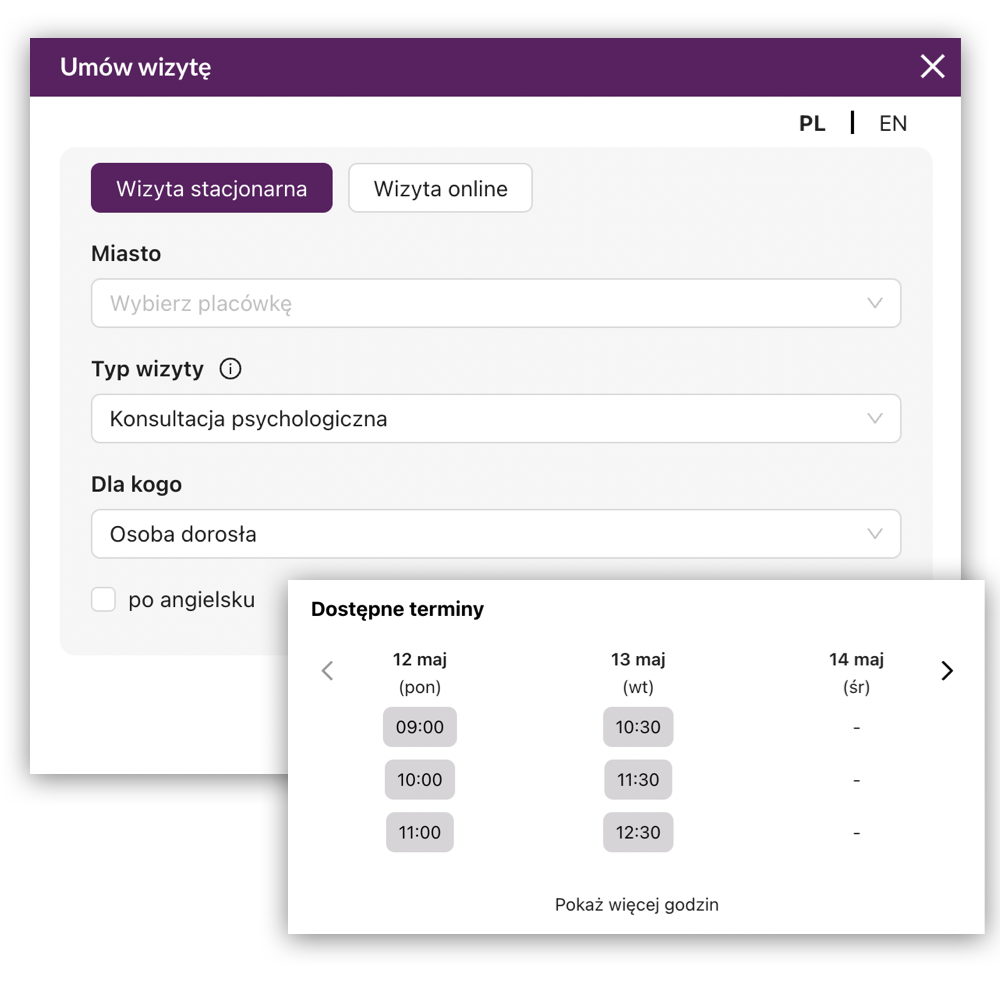 Intuitive widget on the website that guides patients step-by-step – no phone calls, no waiting. And most importantly – available 24/7, 7 days a week.